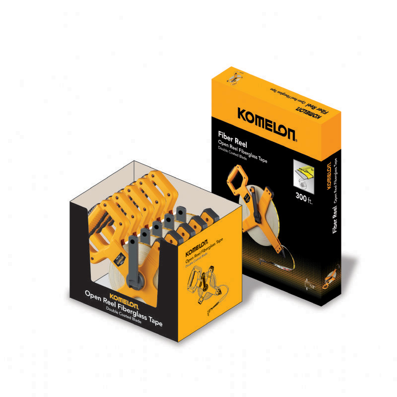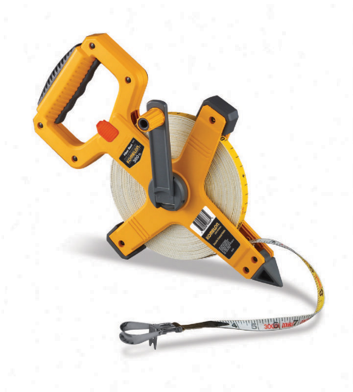Komelon's open reel fiberglass tapes are perfect for all of your long measuring needs. The double coated fiberglass blade is waterproof and dirt resistant. The coating also protects the markings and graduations from chemical and mechanical abrasion. In addition to a heavy duty abs frame, this tape has a two color blade with double sided printing (engineer scale on back of blade) and a versatile ring end hook and claw. The 6633 is great on any jobsite or athletic field.