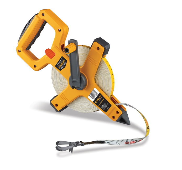 Komelon's open reel fiberglass tapes are perfect for all of your long measuring needs. The double coated fiberglass blade is waterproof and dirt resistant. The coating also protects the markings and graduations from chemical and mechanical abrasion. In addition to a heavy duty abs frame, this tape has a two color blade with double sided printing and a versatile ring end hook and claw. With its dual scale blade allowing measuring in both inches and metric, the 66330IM is great on any jobsite or athletic field.