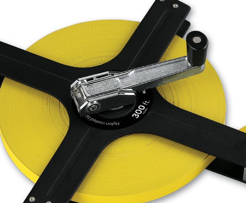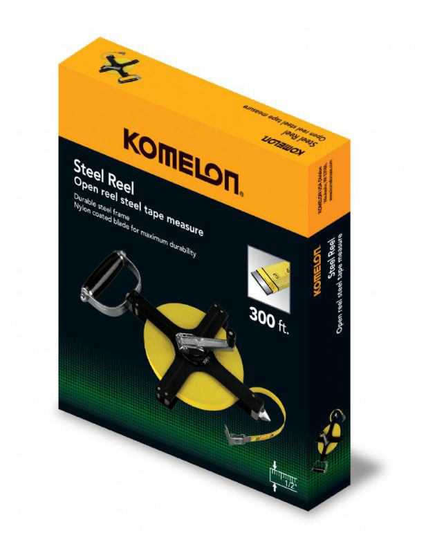 Get some distance with Komelon's 300' Metal Frame Steel Reel. This reel was built for professionals by experts who know what a professional demands. This long steel tape is used by many contractors, concrete workers, road construction crews, and various other professionals who need accurate distance measurements. This Metal Frame Steel Reel has a versatile end hook that includes an innovative ring hook. Another great feature this long steel tape offers is the quick release handle. If you're pulling tape out and don't want the handle winding, just release the handle and it will stay in place as you pull out tape. The second you get your hands on this steel reel you will understand it means business and it will be your tool of choice for ages.