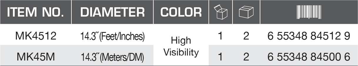 These 14.3" diameter wheels are perfect for almost any outdoor use. They have a comfortable pistol grip, telescoping handle, accurate gear driven counter, and a kickstand. While it is durable enough for outdoor use, it also has a composite tread to help improve traction on smoother surfaces. The 45 series wheel will stand up to any measuring job you throw at it.