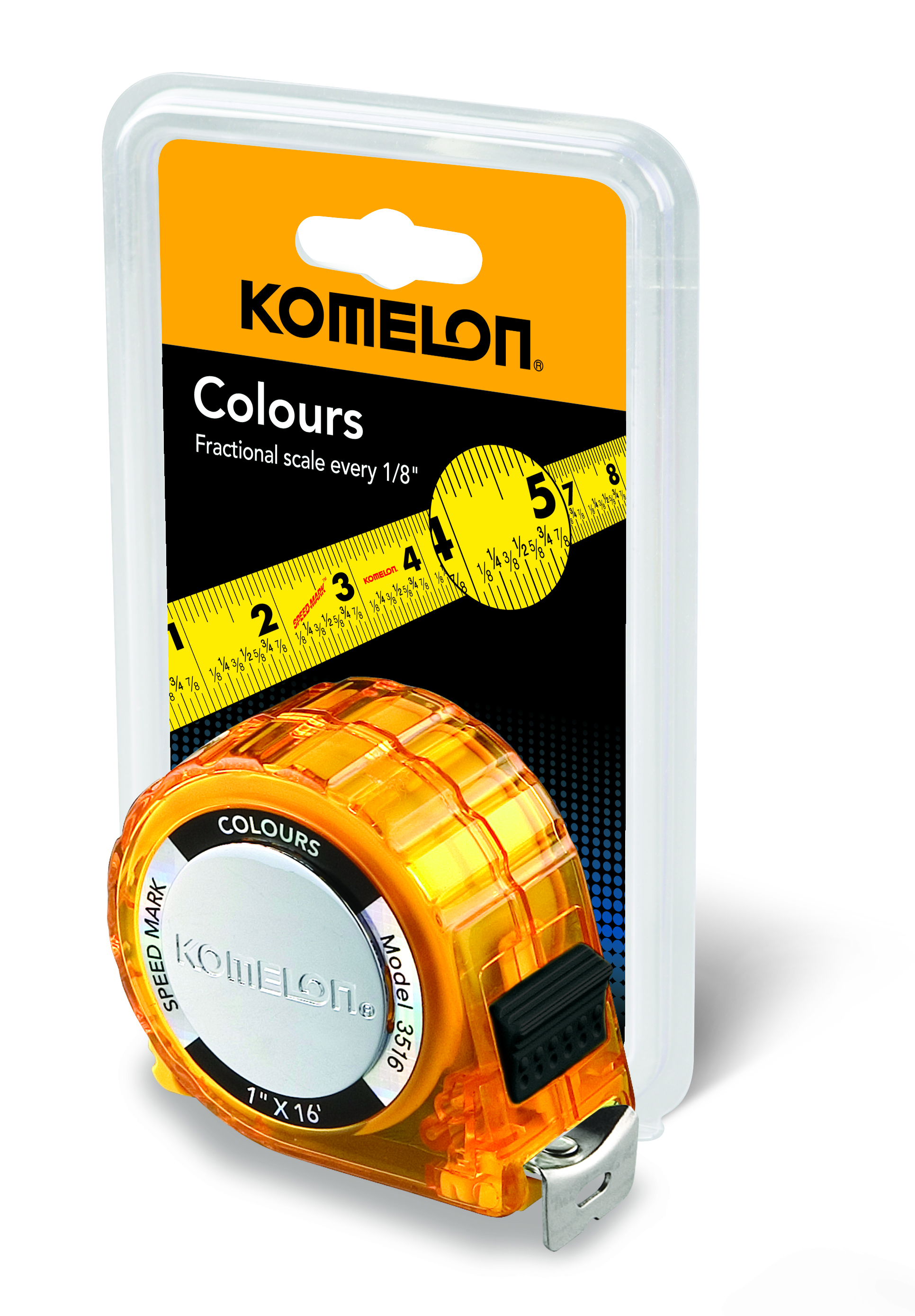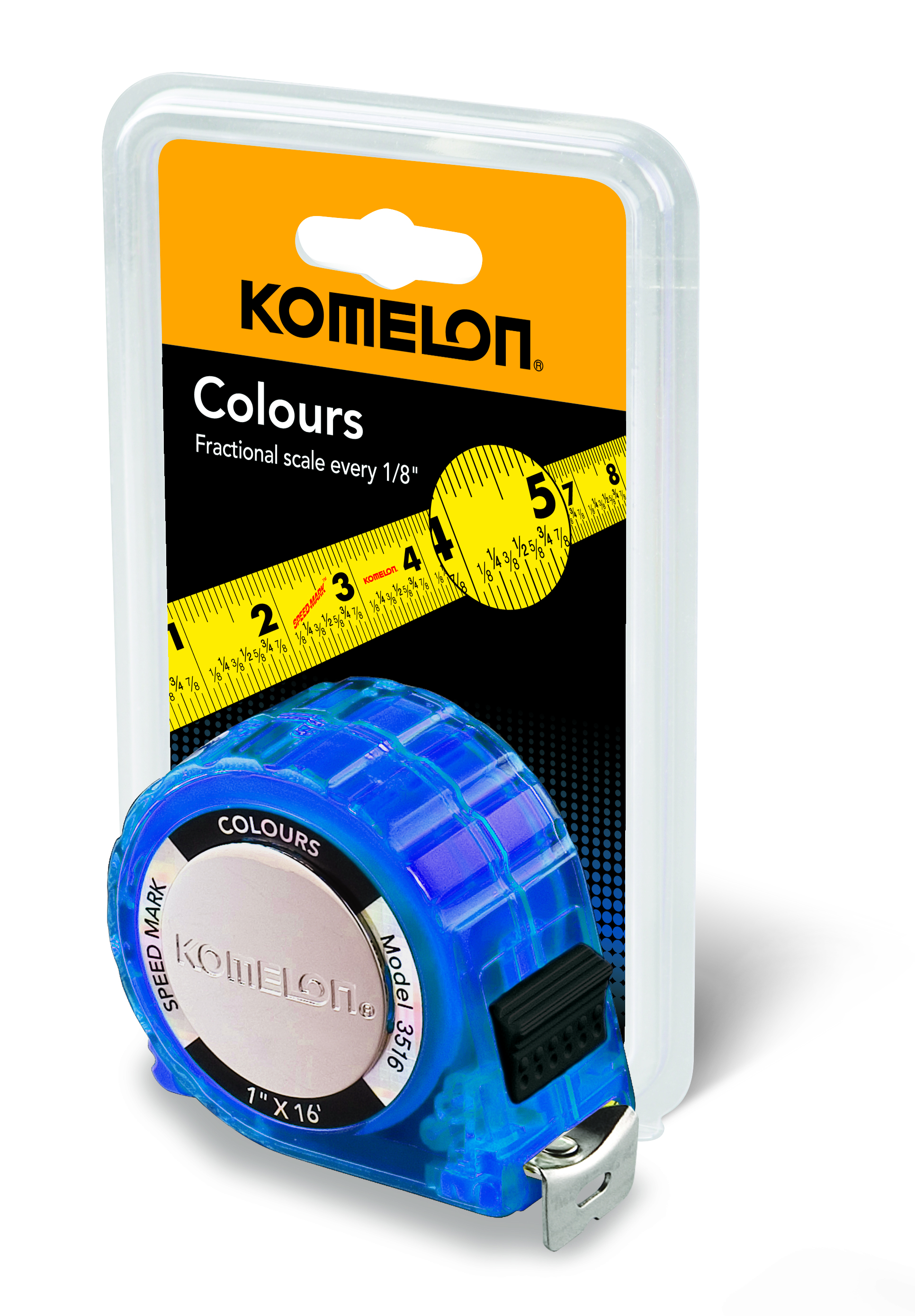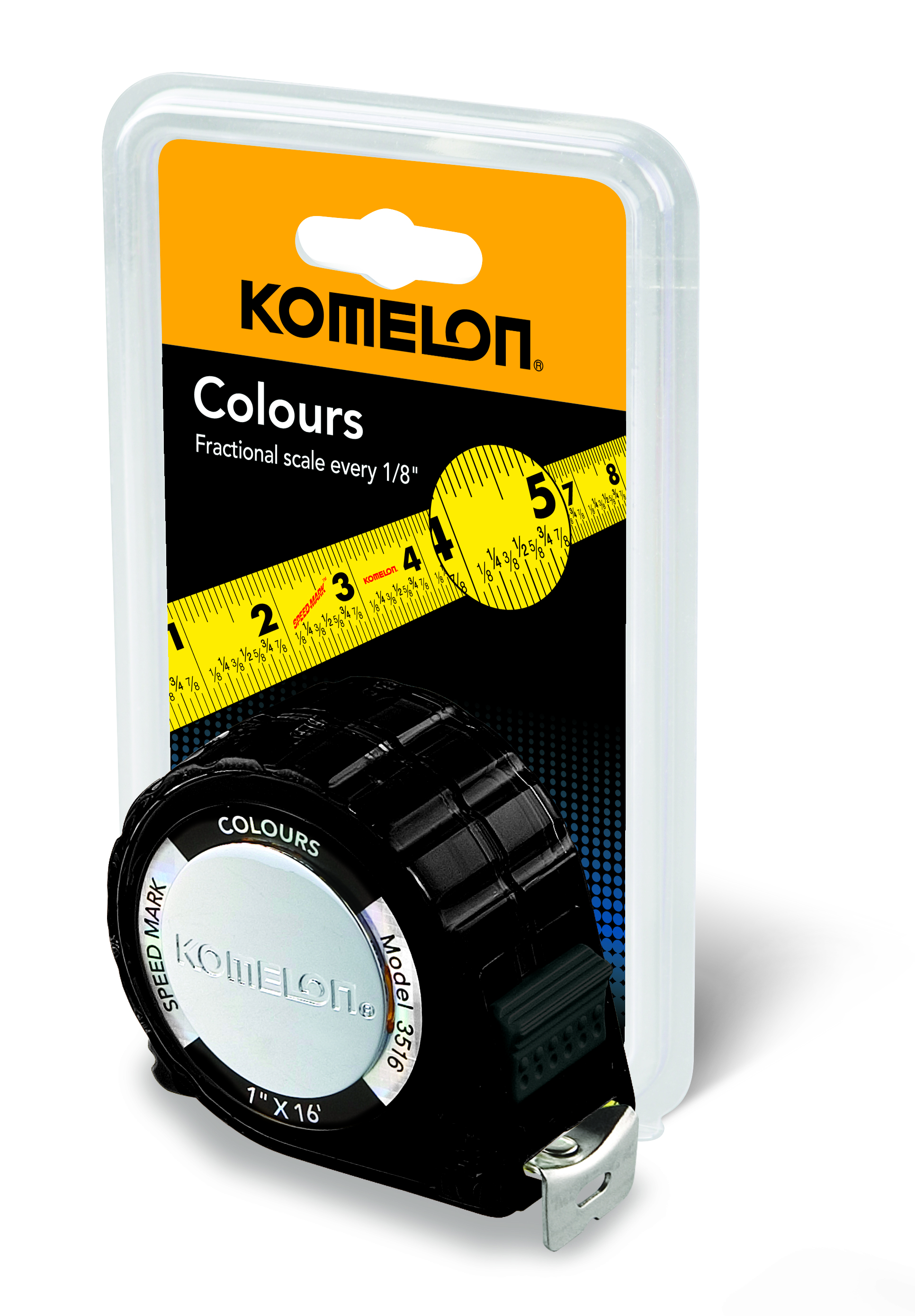 What is a good household tape measure and what makes it so good? This is the question we asked ourselves at Komelon and we answered with Colours. These 16' x 1'' assorted, eye catching tape measures are perfect for household chores and small jobs because of their compact size, the fractional graduations printed on the blade, and because of the professional grade quality. The Colours are perfect to throw in your tool box or kitchen drawer for your measuring needs.