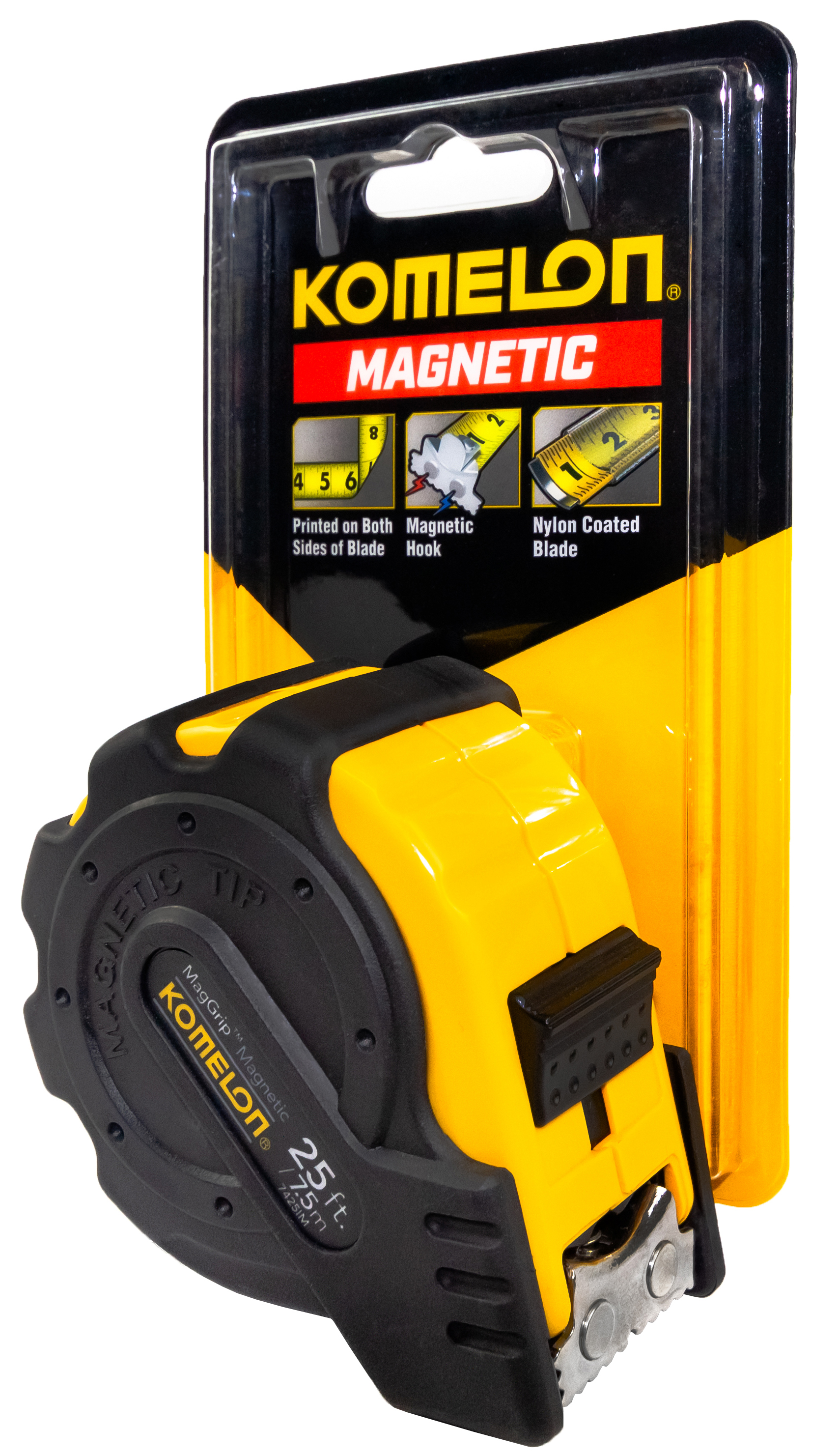 The MagGrip is the tape measure that changed the industry as it introduced the magnetic tip. More than 10 years ago Komelon was the first to offer the innovative magnetic tip and we did it with the MagGrip. This 25' x 1'' inch/metric scale tape measure fits perfectly in the users hand and is protected by a thick rubber jacket. The flared end hook will stick to any metallic surface with its strong magnets and the large read numbers on the blade are protected by Komelon's nylon coating. The MagGrip has proven durability throughout its lifetime and will continue to serve you for many years to come.